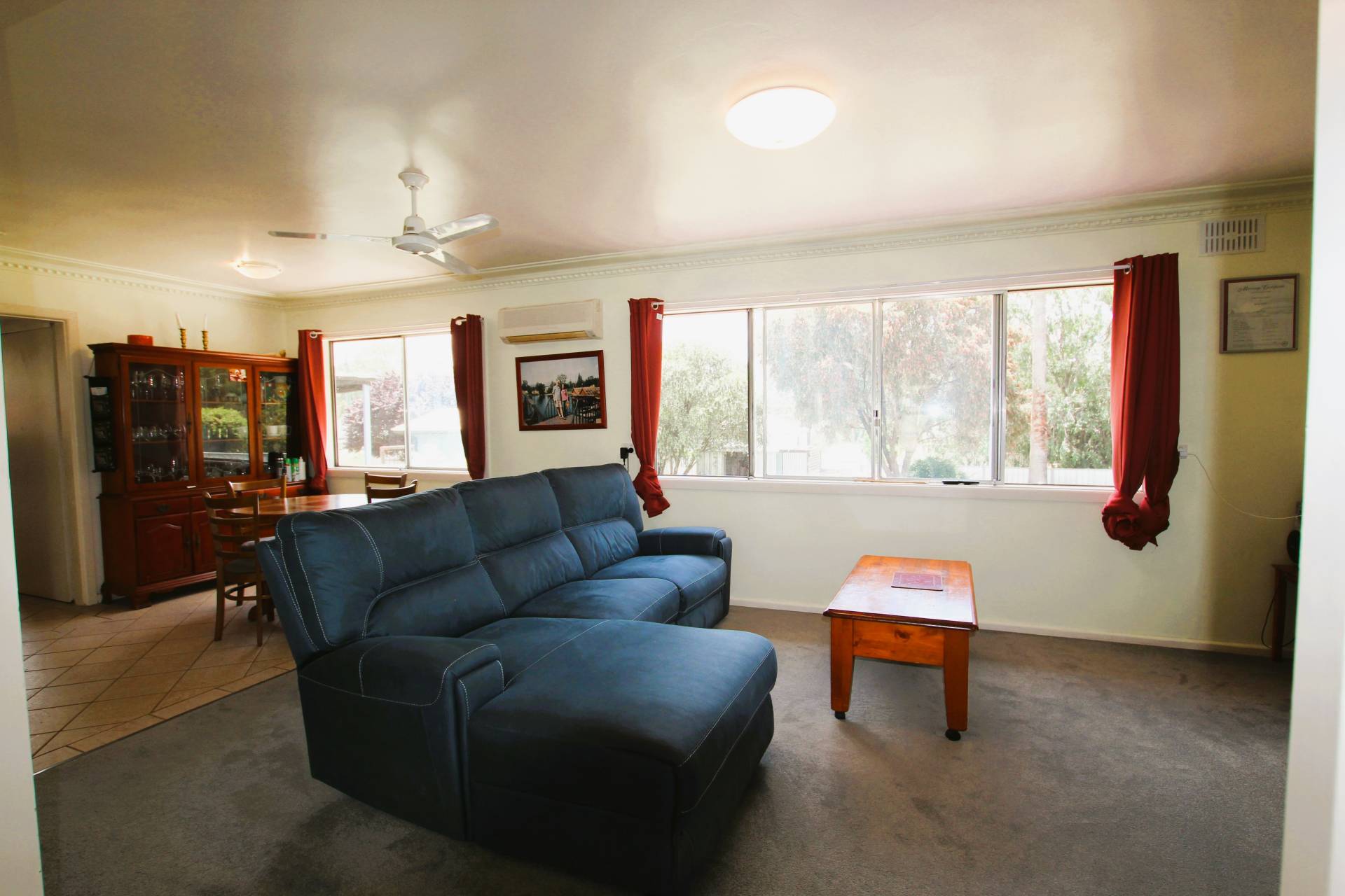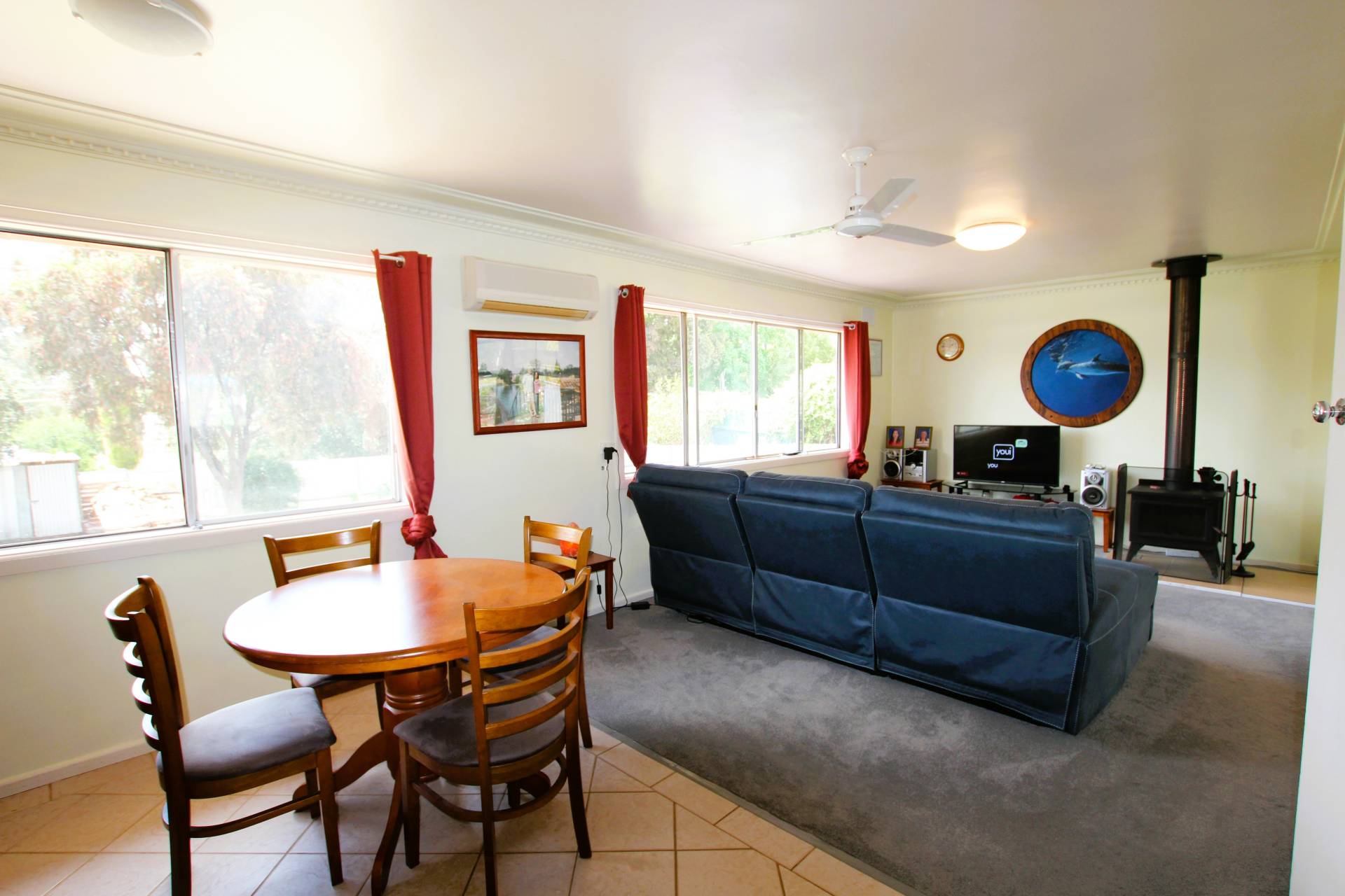 On entering this home is a sunken lounge/dining entertaining area that steps up into another spacious lounge dining room with cozy wood fire and air conditioner.