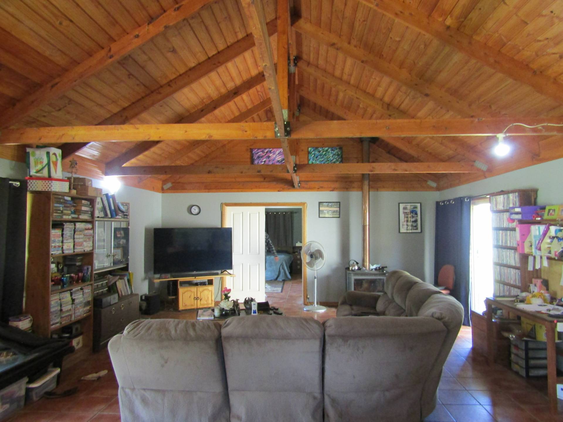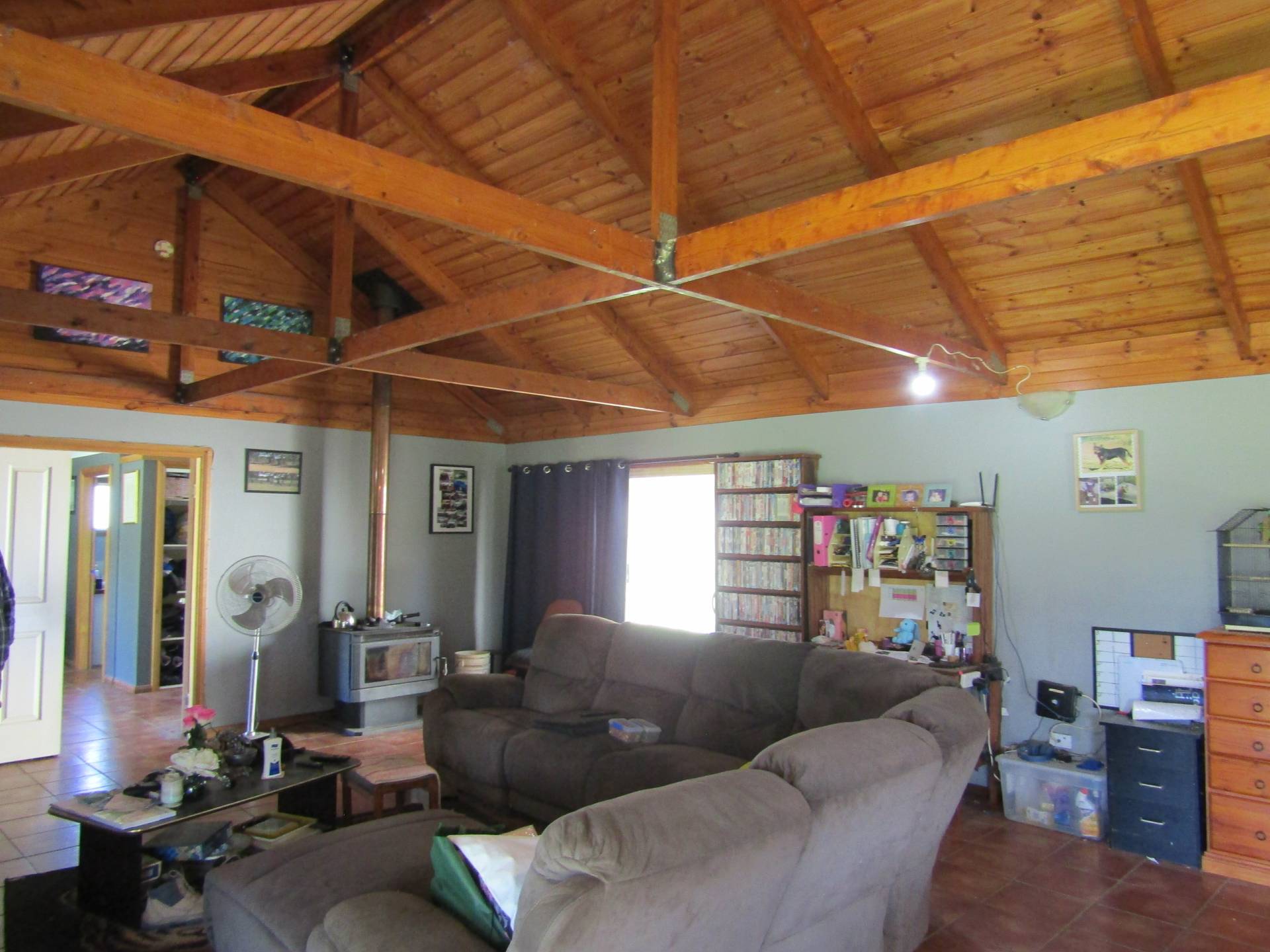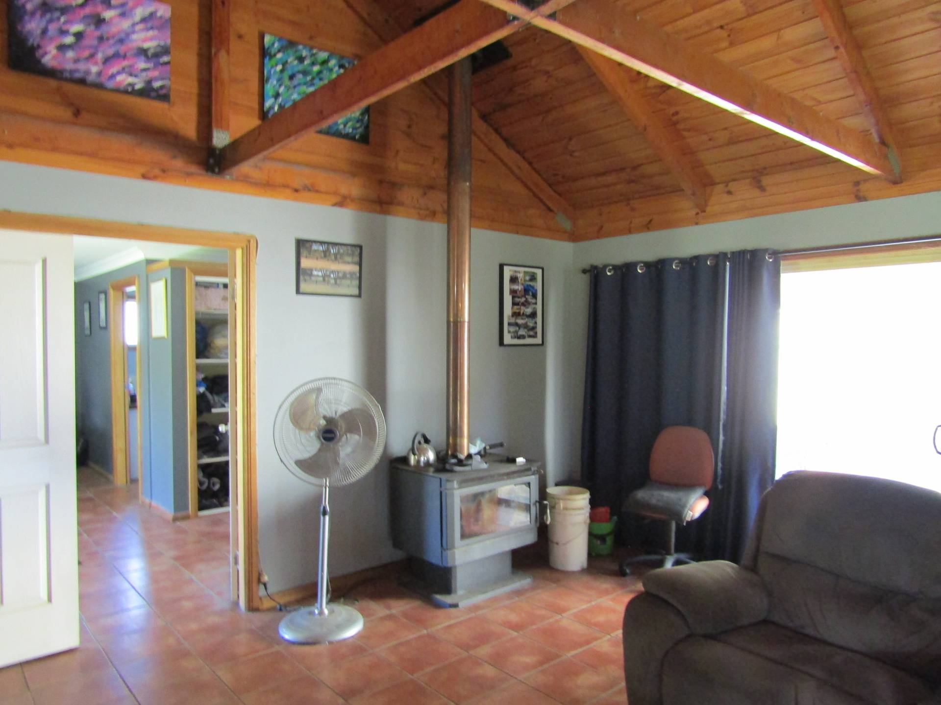 •    Spacious open plan living lounge room with cathedral ceilings timber beams with a  cosy wood fire