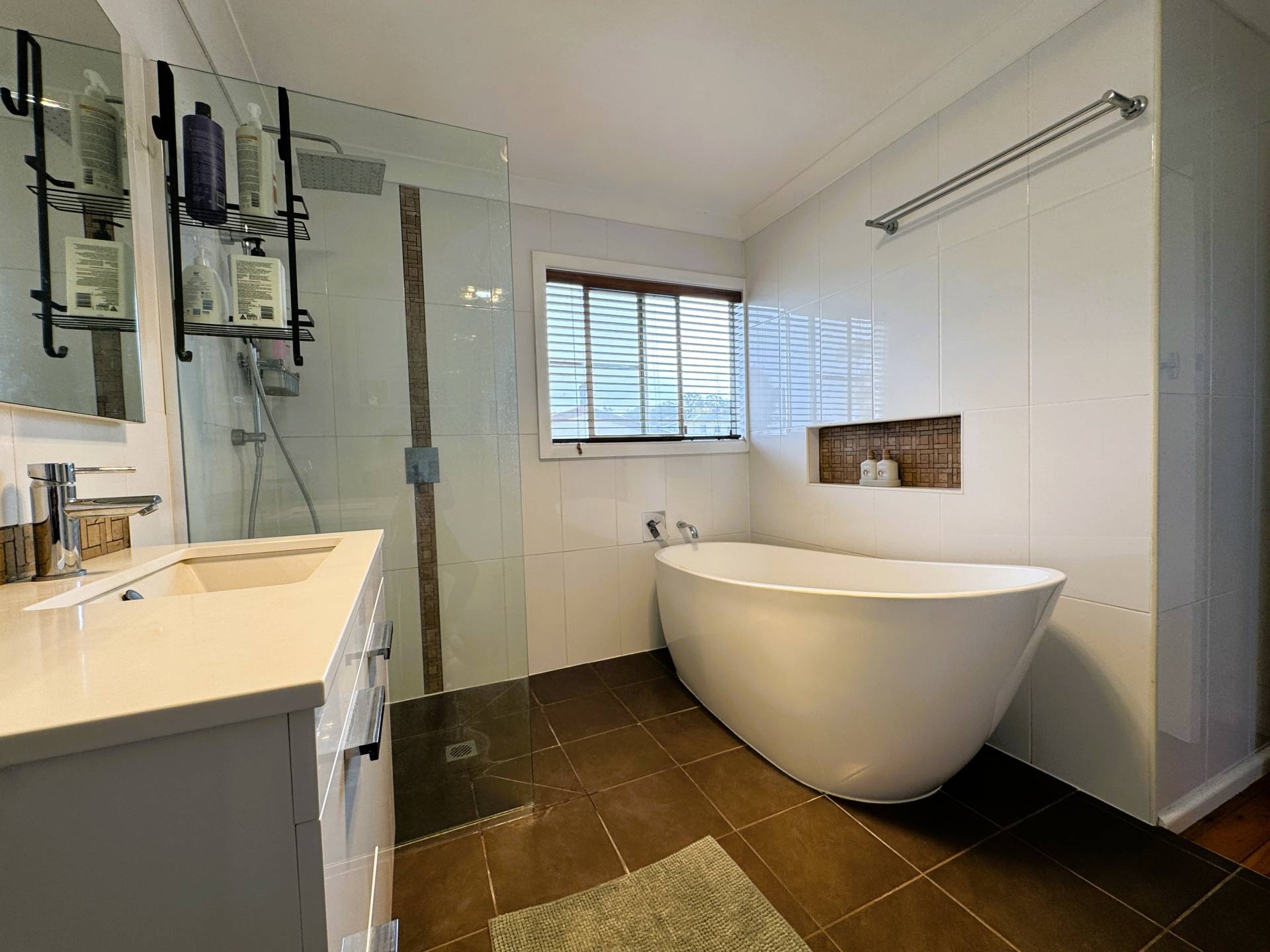 • Modern bathroom with shower and large soaking bath