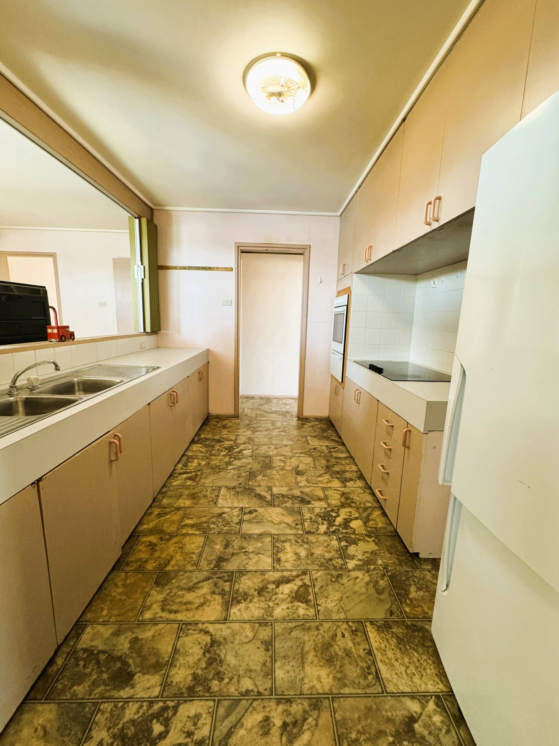 *  Original kitchen with wall oven cooktop and dishwasher and servery into dining room