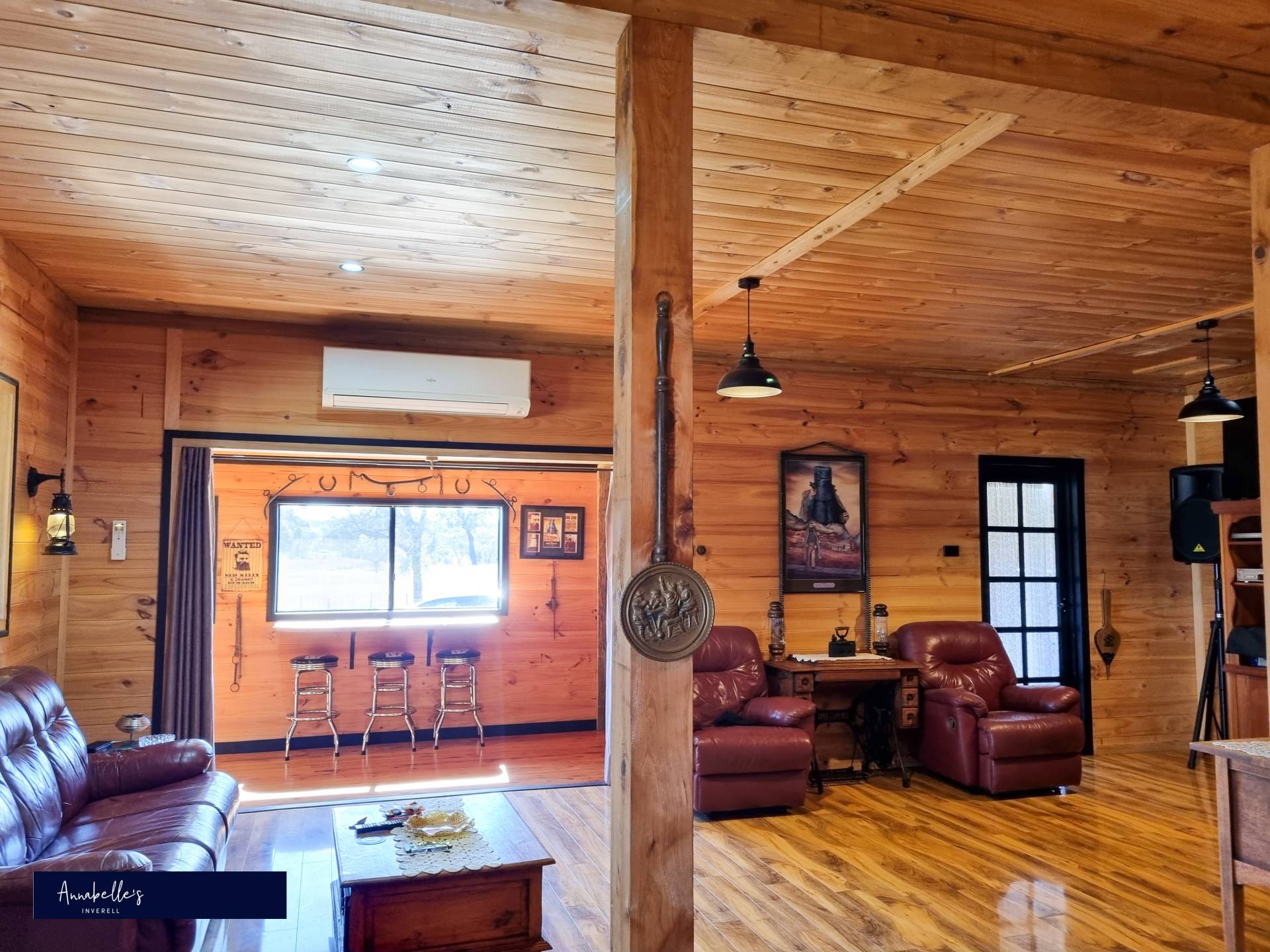 This home has timber features throughout, large main-bedroom with walk-in dressing room and ornate ensuite, open plan lounge/living and dining area with air conditioning, kitchen with large oven and original stove adding to the warmth, views overlooking the farm, breakfast bar for the morning coffee or afternoon refreshment, separate office, original lantern lights to give the home a step back in time feel with all the modern touches. Solar panels fitted to the house for energy efficiency.